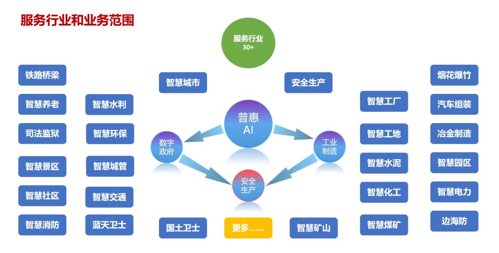 产品已在安全生产、工业互联网、智慧城市、水利、环保、电力、工厂、工地、石化、消防、司法、港口等各行业广泛应用。目前实际项目落地应用行业30+,落地交付项目800+,算法应用场景300+,AI安全助手出货量1000套以上。